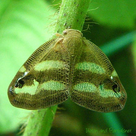 タンポポの種のような傘状のロウ物質を腹端に持つ。お尻をたてる角度次第で傘の向きを変えられるので、クジャクのように背後に広げたり、背中に背負うようにぴったりつけたりと傘の位置を自在に変える。食草は主にクズを好む。