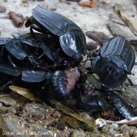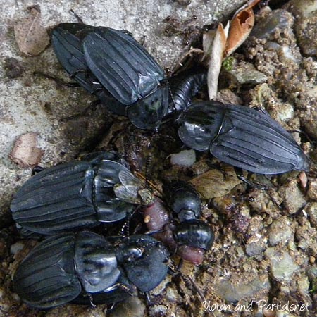 体長2cm強、オオヒラタシデムシがミミズを食べています(こういうのをアップで出すのもウチが敬遠される理由の1つでしょう)。ありがちな光景です。ニクバエの仲間も参加していますね。オオヒラタの幼虫も来ています。さらにもう1頭、体長1cmに満たない小型のコウチュウが食事に来ています。それが何だかわからなくて悩ましい写真になってます。興味ある方は画像にマウスを乗せて見てみて下さいね。
