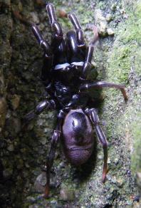 ジグモといえば、壁にくっついた(土の中に半分埋まった)長細い袋を想像するんですが、壁の隙間にいたのですぐにはジグモとわかりませんでした。逞しいムチムチの前脚に微毛がびっしり。