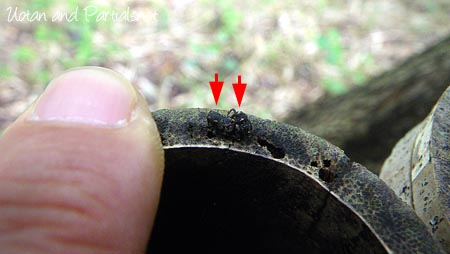 体長4mm前後の小さなゾウムシが古い竹材で一所懸命に穴を穿っている。黒いひょうたん型のボディには白い鱗片がまばらに散らばっている。