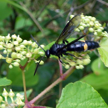 写真では大きさがわかりにくいですが、ハバチ類よりかなり大きく、アシナガバチ・サイズです。コガネムシ科の幼虫に卵を産みつける寄生バチですが、成虫のお食事は花などの蜜。特徴のあるお腹の黄色紋は飛ばないとなかなか見えません。