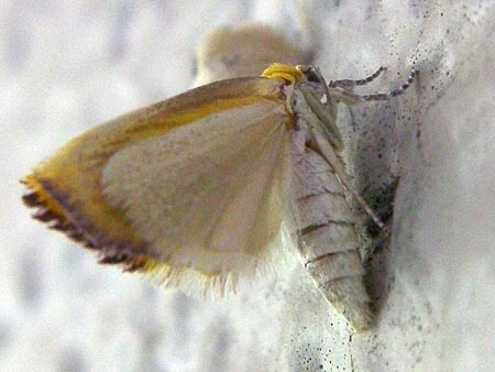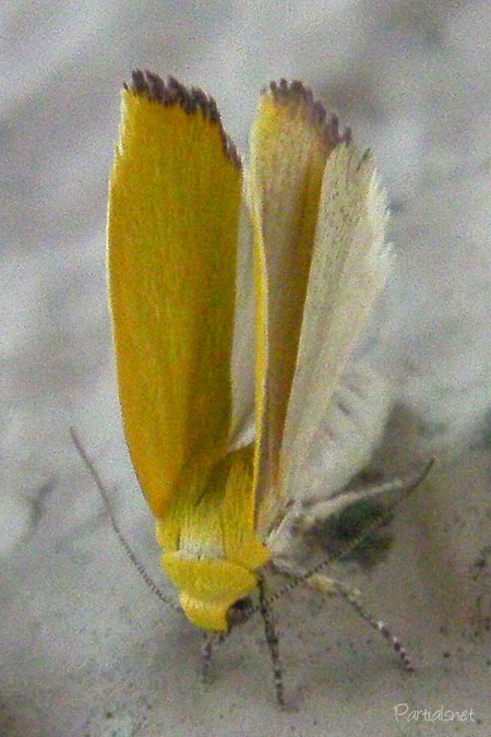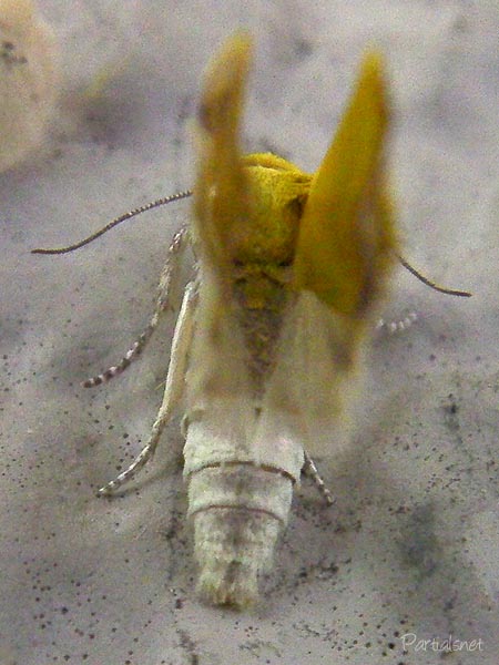 家の前の壁に複数ついていた、ふやけた飯粒ぐらいの大きさの小さな繭から羽化した黄色の蛾。当初「まゆから黄色の蛾が羽化したけれど」というタイトルで掲載し、種どころか科も不明でした。