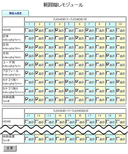 スキンHTML内で、タグで囲んだ範囲を隠すモジュールです。基本は全て隠す状態になっており、表示させたいモードをチェックで選択します。20範囲まで指定可能。BlognPlus2.6.2 テキスト版・MySQL版、BlognPlus2.5.6テキスト版 で動作を確認。
