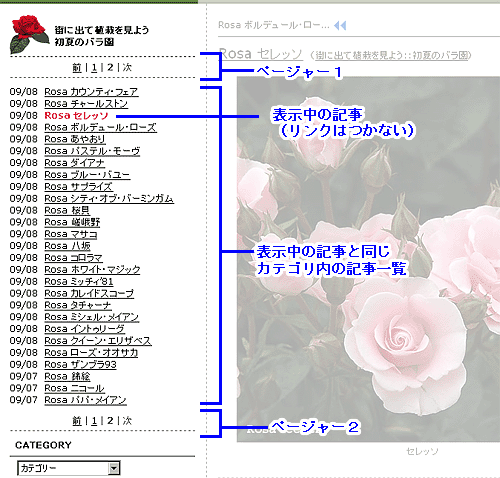 この一覧モジュールから記事を閲覧し、ページャーでページめくりしていても、カテゴリ間移動モジュールによる次へ・前へのタイトルをクリックしてしまうと、ページャーでめくっておいたページが1ページ目に戻ってしまいます。