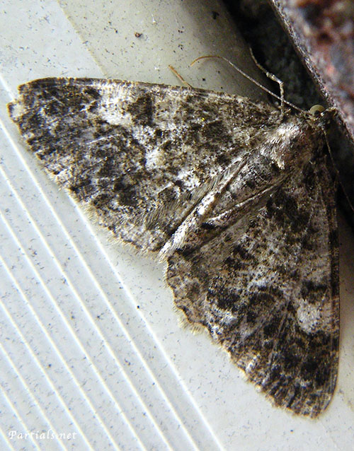 三角形に止まる、木肌のような曖昧な色模様の蛾。翅の中程に白っぽい太い筋が横に走る。