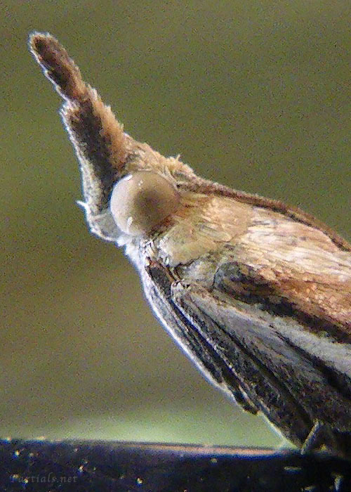 縦に長く銀鼠色の小型の蛾。翅の上部に茶と黄色のラインが横に走る。胸を突き出し下唇髭が前方へ突出するので顔が尖って見える。大豆の害虫として知られる。