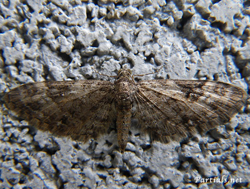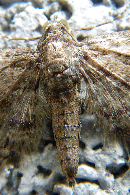 木肌色模様で横に細長い小型の蛾。模様も曖昧で近似種も多い事から、間違いの可能性あり。