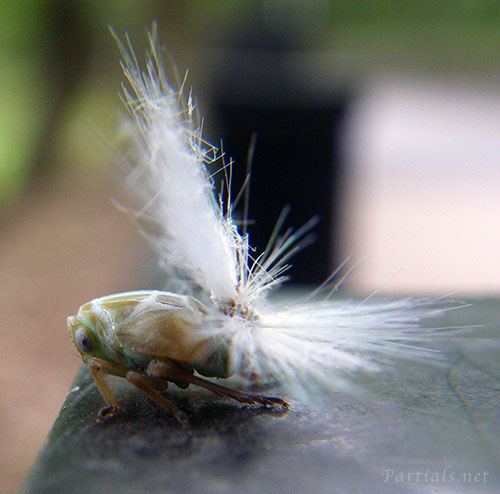 体長1cm前後、カシ類の樹木のそばでよくみかける。羽化後しばらくは抹茶色の粉をまとっているが、次第に粉がとれて黒っぽい色に変わる。