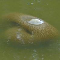 オオマリコケムシの群体。ひとかかえもある巨きなもの。とにかく巨きい。池が浅くなっているため、目立つこと目立つこと。これをルアーでひっかけた人もいるようで、池の中程でまっぷたつになってるのも浮いていました。