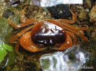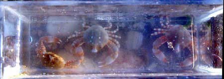 さっそくあちこち探してみると、色違いで全部で3匹見つかった。全員、生きてた。赤・青・オレンジの3色カニ。