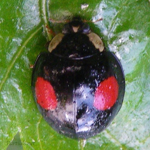 トップ画像のナミテントウは押しも押されぬ正統派の2紋型ですが、模様は多彩でいくつものタイプがあると最近(!)知りました。実は私、恥ずかしながら長い間、黒地に赤2つ星タイプしかしらなかったんです。