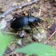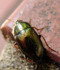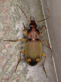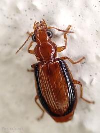 体長8mm前後、マルガタゴミムシ族の飛ばないゴミムシ。雑食。