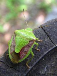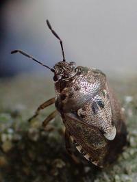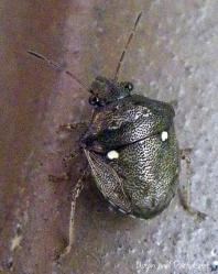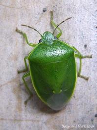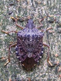 主として草食性、たまに肉食もするという雑食性カメムシ。両肩に張り出した角が水牛のよう。