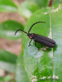 低山の川辺、しっとりひんやりした木陰が続く草深い道の脇。めったやたらとあちこちに居ました。鮮やかな紅色の小さな甲虫がちょっと飛んではとまる姿が目だちます。